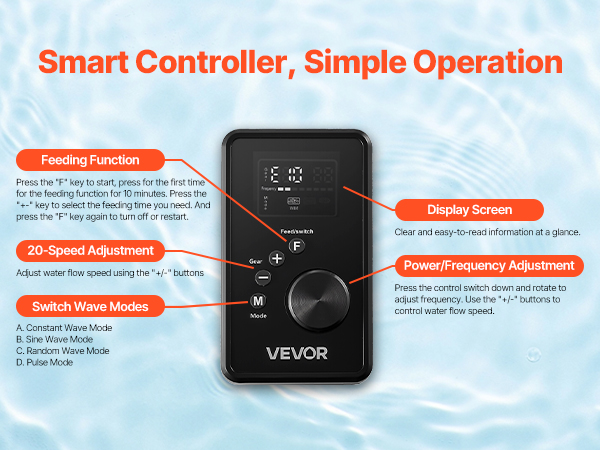 Switch between modes effortlessly with the controller. You can easily adjust the water flow rate and wave frequency, or activate the feed mode.