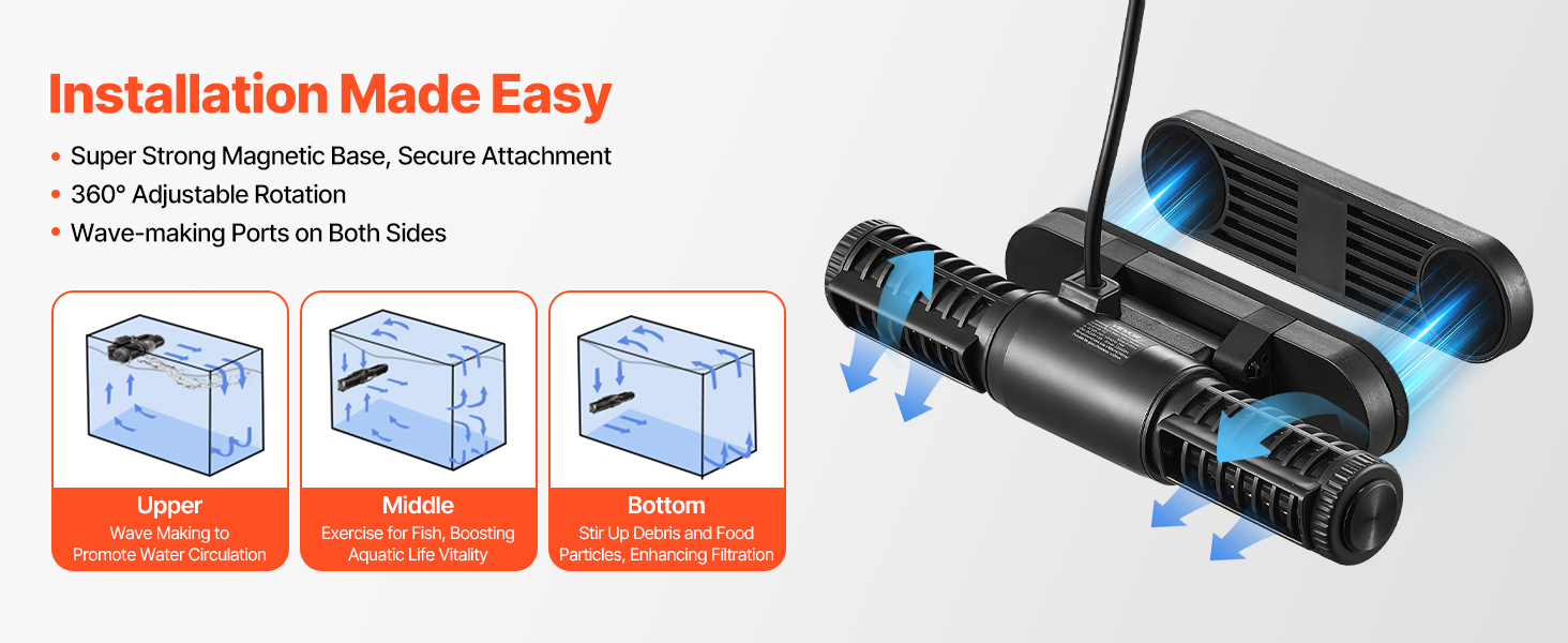 - 360° Full Range Adjustment: With a rotatable pump head and strong magnetic base covered in rubber, the cross flow pump provides 360° rotation to create waves from all directions. Ensure your tank’s pets get the natural water flow possible