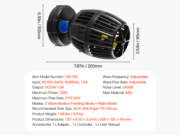• Compact & Efficient: Designed for efficiency, our small yet powerful fish tank wave maker delivers up to 2113 GPH with only 20W of power consumption. Ideal for 50-70 cm aquariums, it operates securely with a 24V DC low-voltage power supply