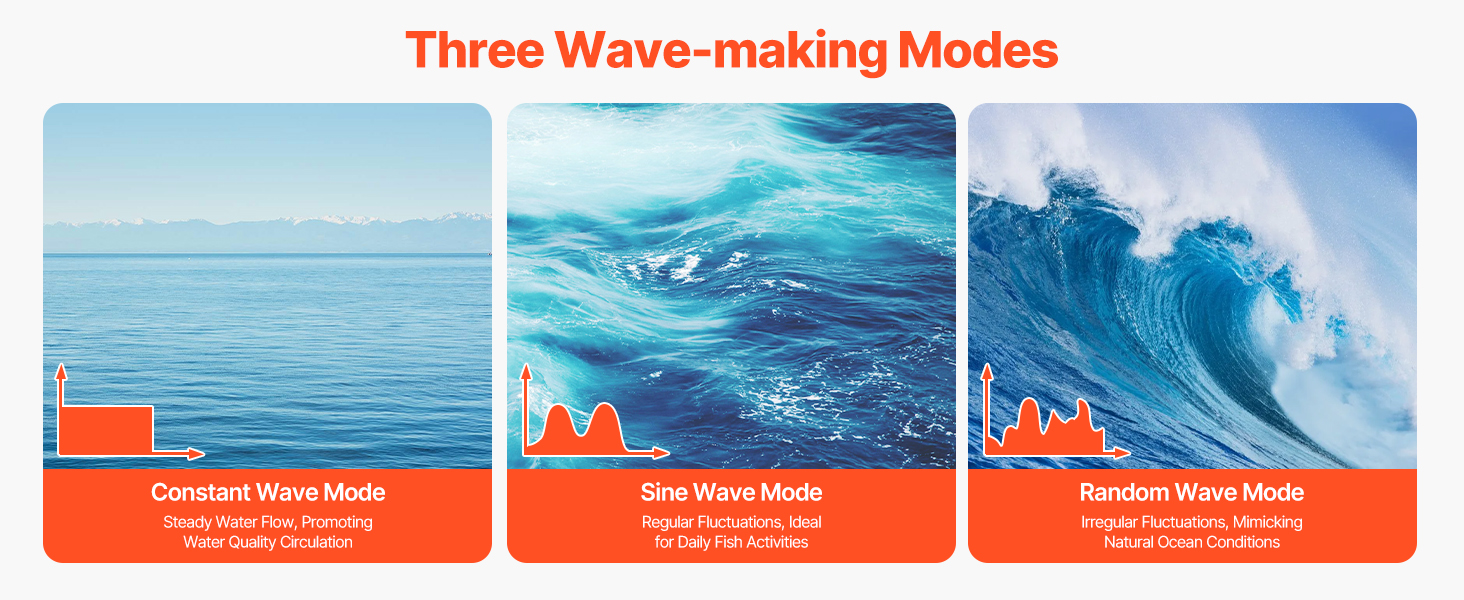 • Simulate Real Ocean Currents: Featuring three wave modes: wave mode, random wave mode, and constant wave mode. This aquarium wave maker mimics real ocean currents, creating a natural environment for fish and corals