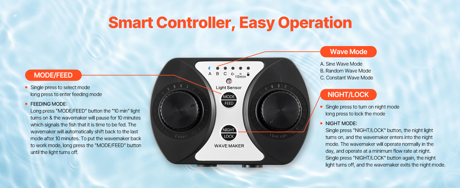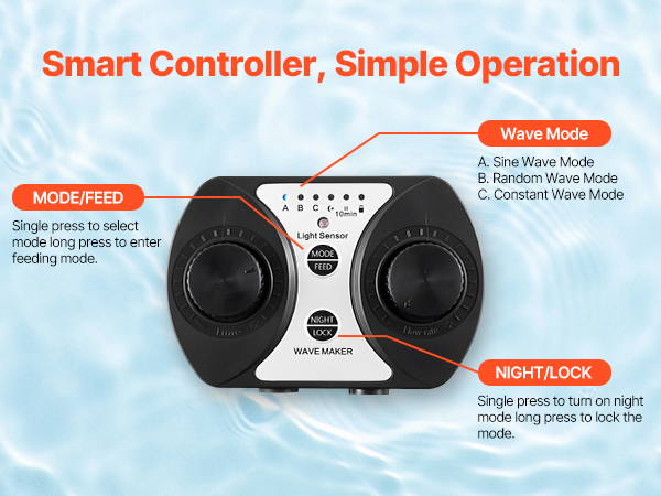 • Multi-Functional Controller: Take full control with our multi-functional controller! Adjust wave frequency and water flow rate with dual knobs. Enjoy additional features like feed mode, night mode, and key lock for added convenience