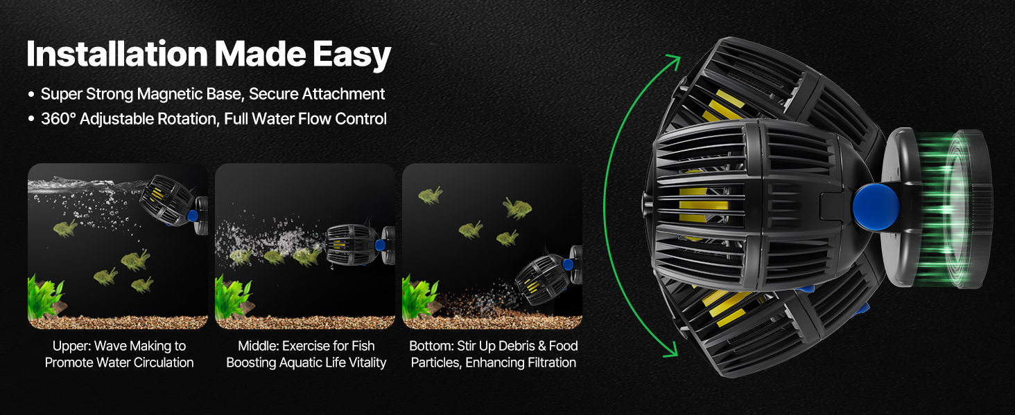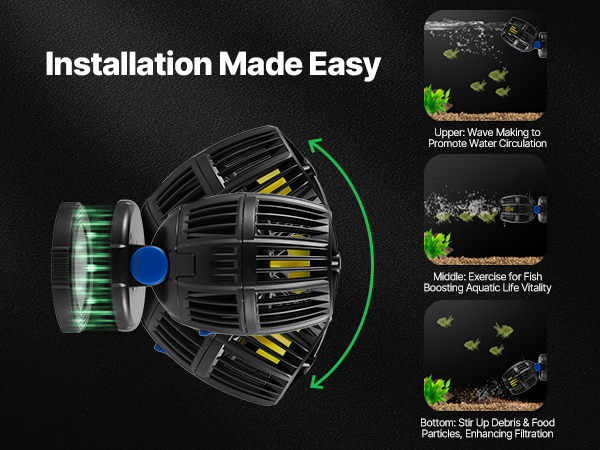 Quick and hassle-free installation! This wavemaker for saltwater aquarium provides 360° water flow simulation, enhancing water circulation and improving water quality by reducing waste buildup.