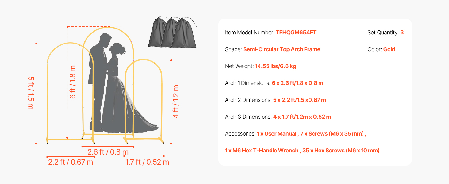 • Elegant Design: This 3-set arch backdrop stand, with dimensions of 6 x 2.6 ft, 5 x 2.2 ft, and 4 x 1.7 ft, is suitable for indoor and outdoor use. It enhances the visual appeal, creating a unique romantic atmosphere for any celebration