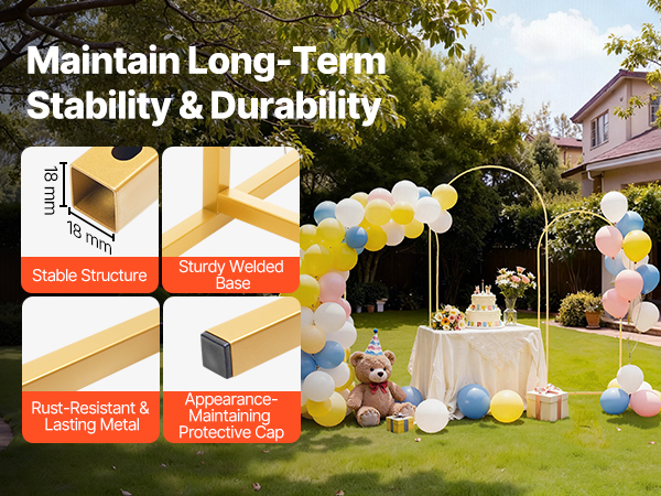 Featuring 0.71 x 0.71 in/18 x 18 mm metal square tubes, our metal arch backdrop stand is rust-resistant and non-bending for lasting use. With a reinforced welded base, it enhances stability. It also adds a foot cap, which is both beautiful and dust-resistant, suitable for indoor and outdoor use.
