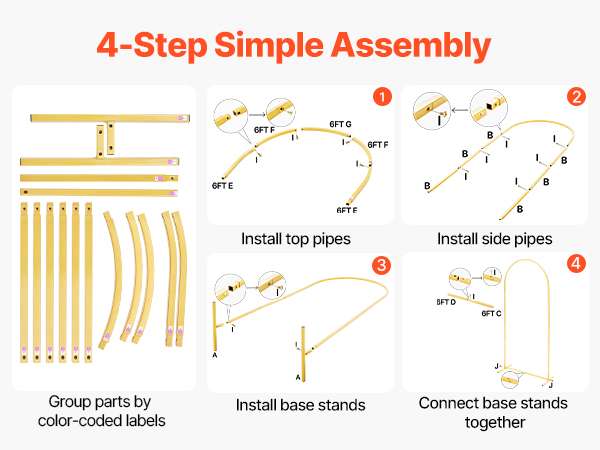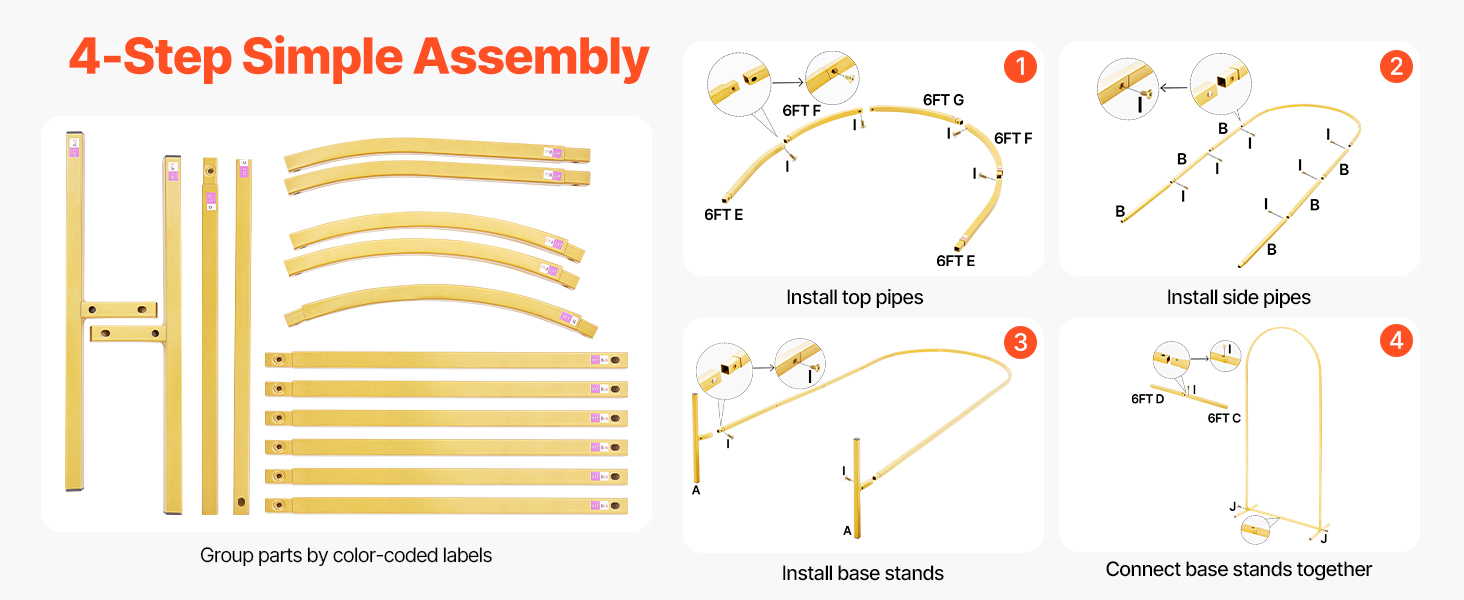 • Easy Assembly: Our gold arch backdrop includes an instruction manual to show each step of the installation clearly. Each part is numbered and color-coded to correspond with the manual, making grouping and assembly simple without stress