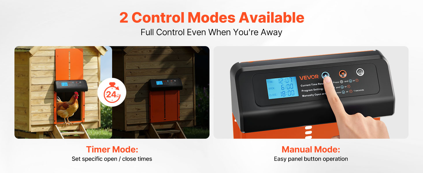 - Two Operation Modes: The automatic chicken coop door supports timer and manual settings for flexible use. Light-sensor control adjusts to daylight, timer simplifies daily management, remote control offers convenience, and manual mode lets you adjust anytime.