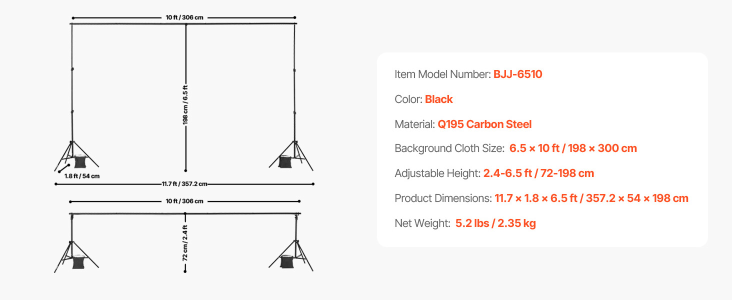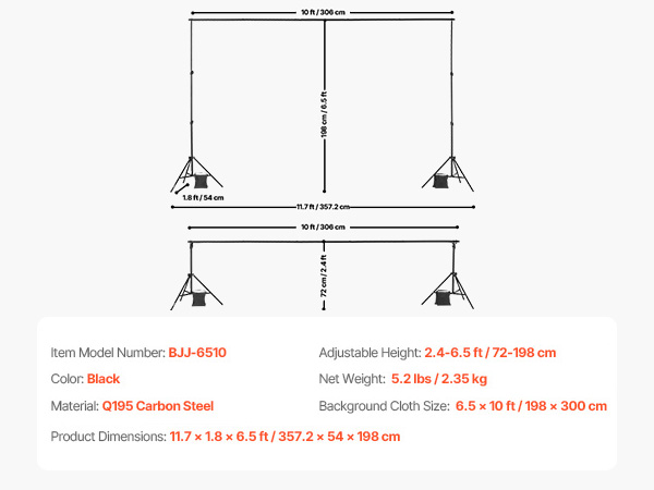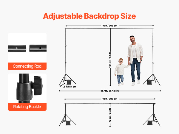 Our adjustable backdrop stand offers multiple size adjustment options. The support poles can extend from a minimum height of 2.4 ft / 72 cm to a maximum of 6.5 ft / 198 cm to accommodate different backdrop sizes.