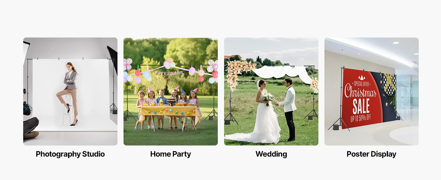 • Multi-Purpose Use: Our background stand is ideal for studio photography, weddings, parties, product displays, and more, meeting all your background needs.