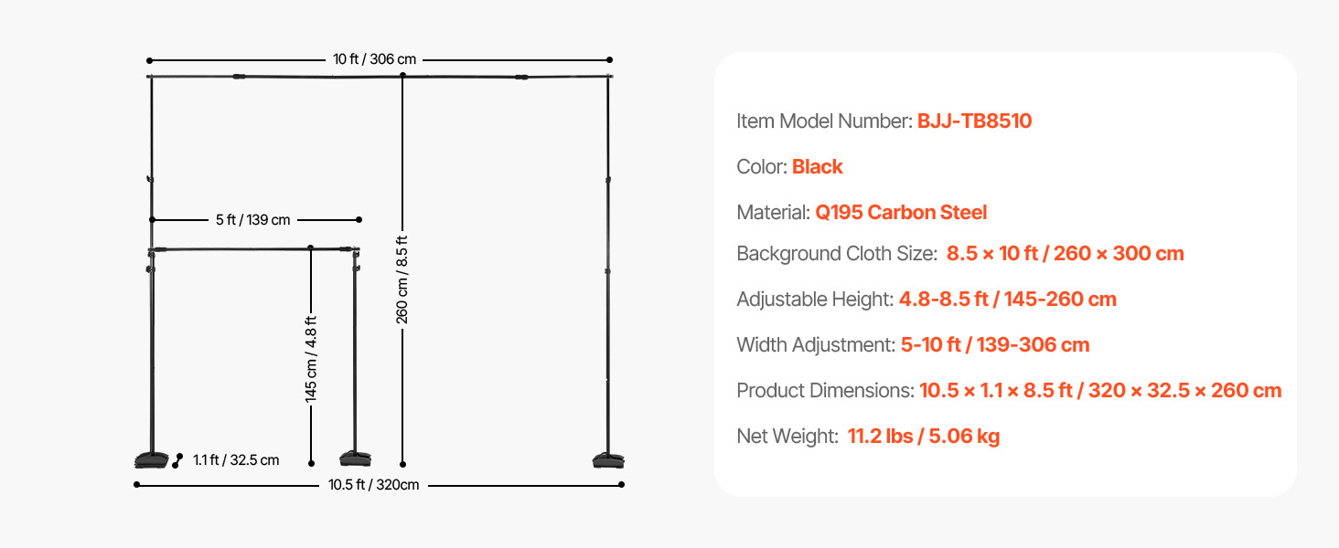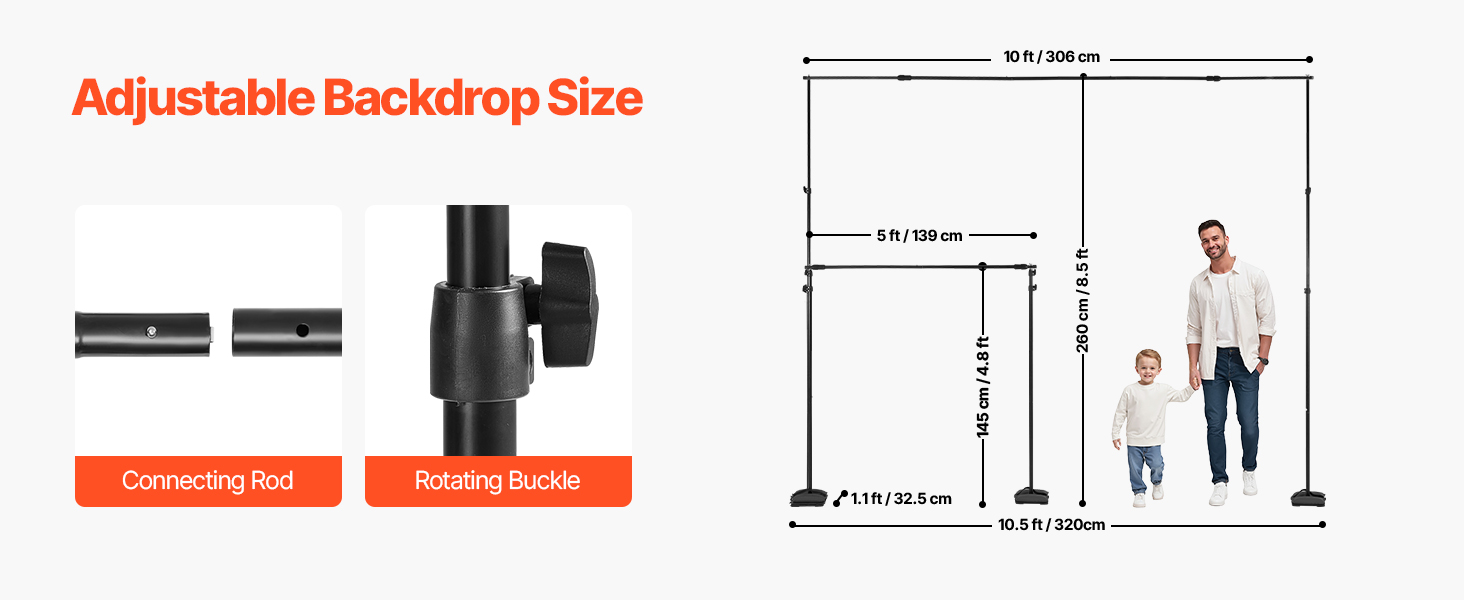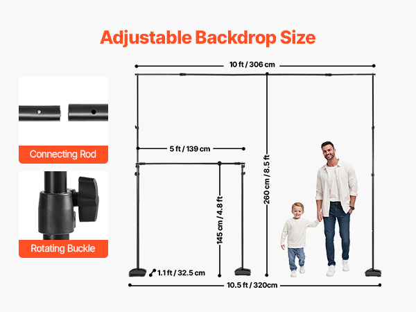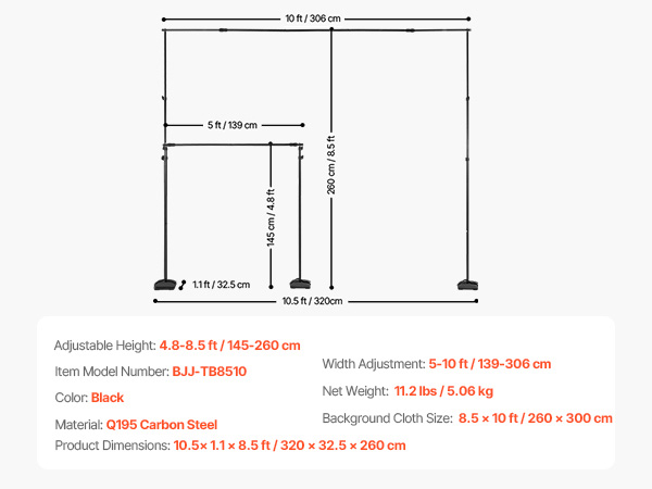 - Adjustable Size: Our adjustable backdrop stand supports backdrops up to 8.5 x 10 ft / 260 x 300 cm. The height of support poles can extend from 4.8 ft / 145 cm to 8.5 ft / 260 cm, and the width can extend from 5 ft / 139 cm to 10 ft / 306 cm to fit different backdrop sizes. Note: This product does not include balloons, decorative items, or backdrop fabric.