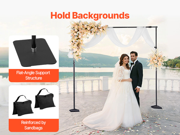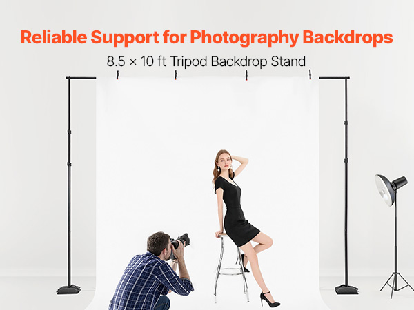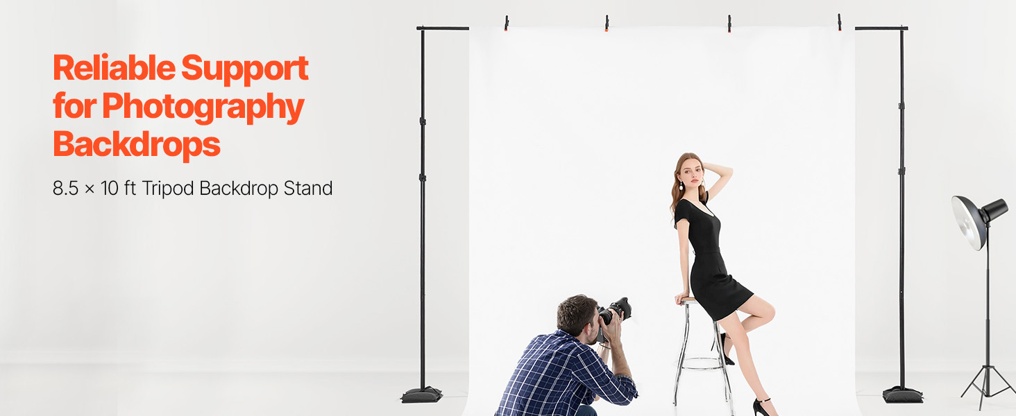 This backdrop stand has a flat carbon steel base for stability and durability, supporting up to 10 lbs. The adjustable size suits large backdrops and is ideal for studios, home use, hotels, and stages.