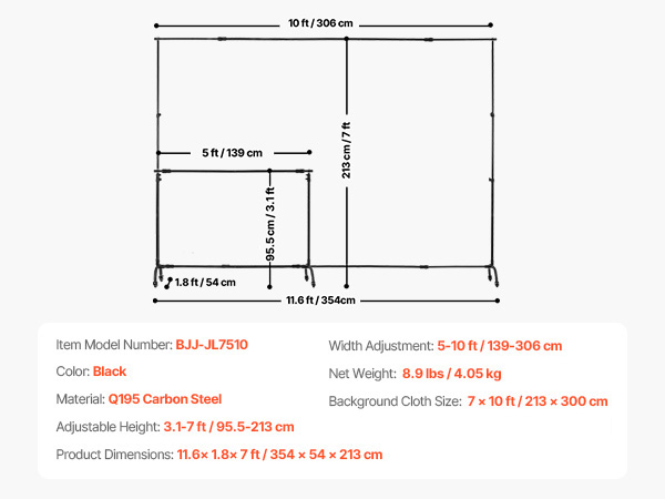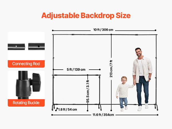 • Adjustable Size: Our adjustable backdrop stand supports backdrops up to 7 x 10 ft / 213 x 300 cm. The height of support poles can extend from 3.1 ft / 95.5 cm to 7 ft / 213 cm, and the width can extend from 5 ft / 139 cm to 10 ft / 306 cm to fit different backdrop sizes. Note: This product does not include balloons, decorative items, or backdrop fabric.