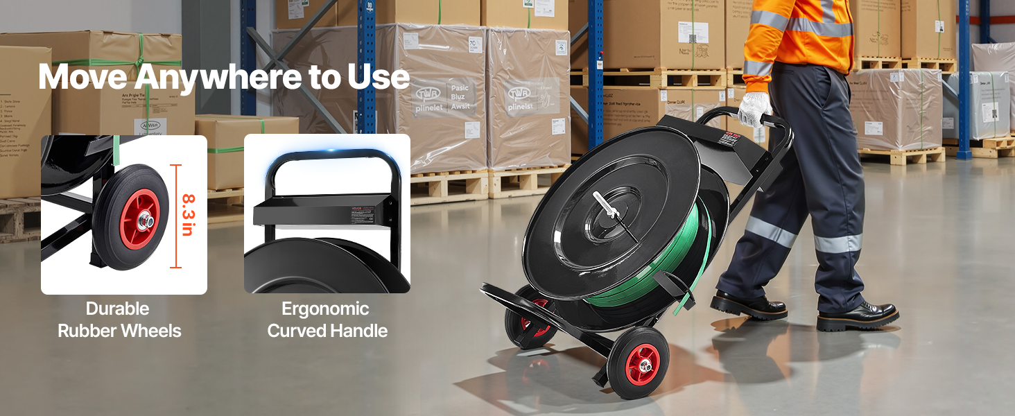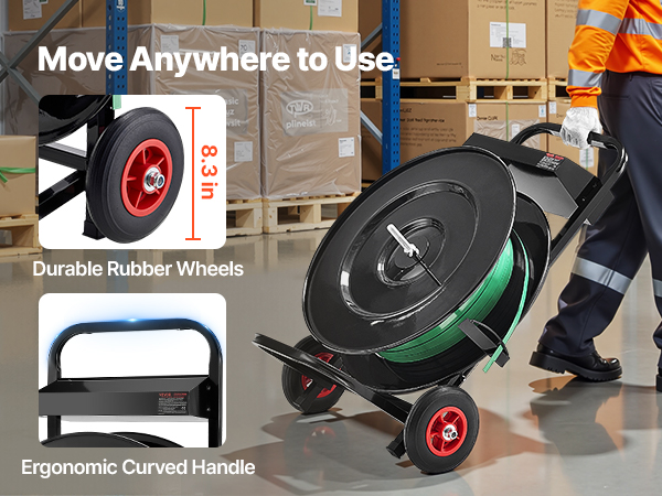 - Effortless Mobility: Equipped with two 8.3 in wear-resistant, low-noise rubber wheels, this banding strapping cart moves smoothly on any surface. The ergonomic handle allows easy repositioning, even in tight spaces