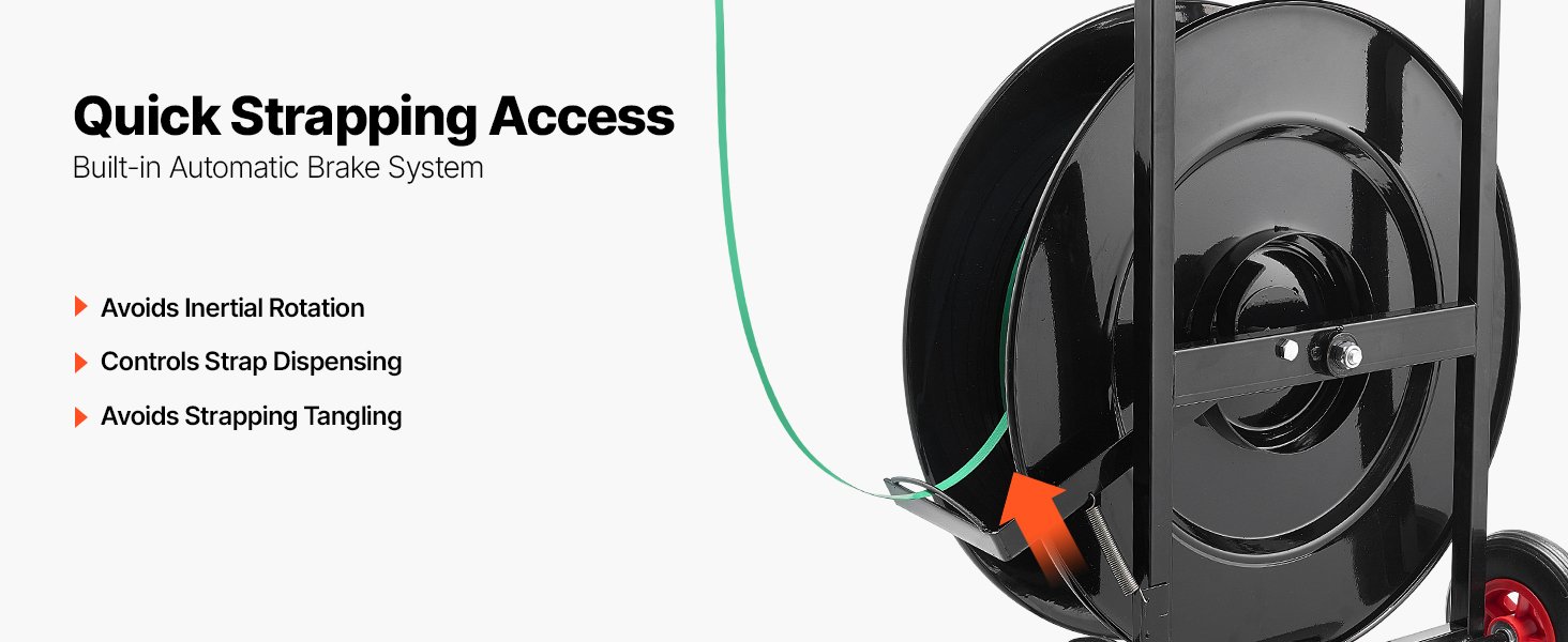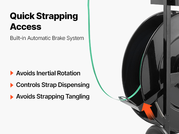 - Built-in Auto Brake: The auto brake of the steel strapping dispenser avoids over-rotation, stopping excess strap from unspooling. It maintains tension stability, avoiding tangling, and allows easy spring tension adjustments for seamless use