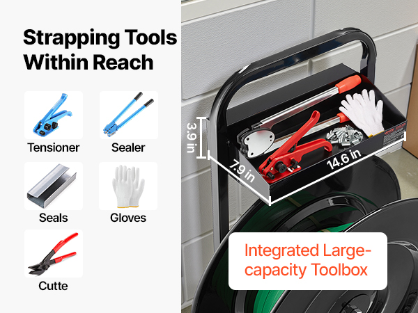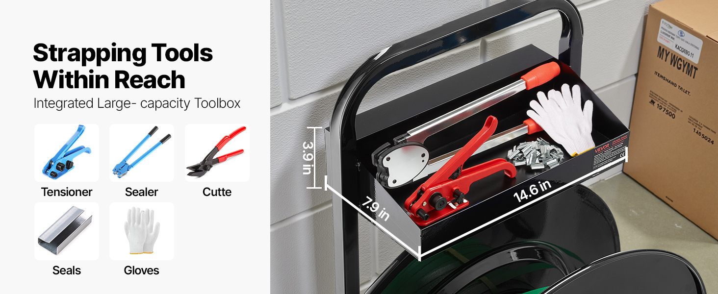 - Convenient Tool Storage: Keep your strapping tools close by with a built-in toolbox. Greatly store your tensioners, cutters, and seals for easy access—no more time wasted searching
