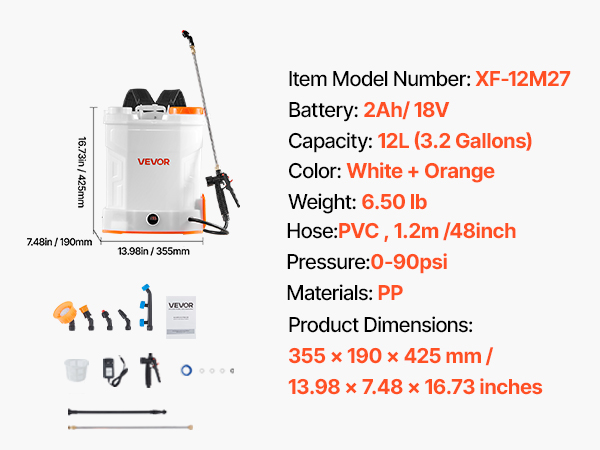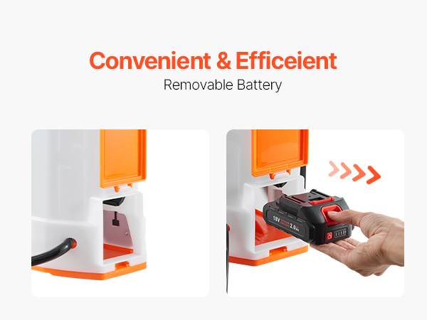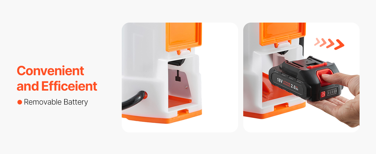 The backpack sprayer with a 18V 2Ah removable battery for 2 hours of use. Adjustable 0-90 PSI pressure, and ergonomic design for up to 8 hours of comfort. Includes 5 nozzles and a dual-material spray rod for more than 10 applications. Leak-proof and easy to operate with one hand.