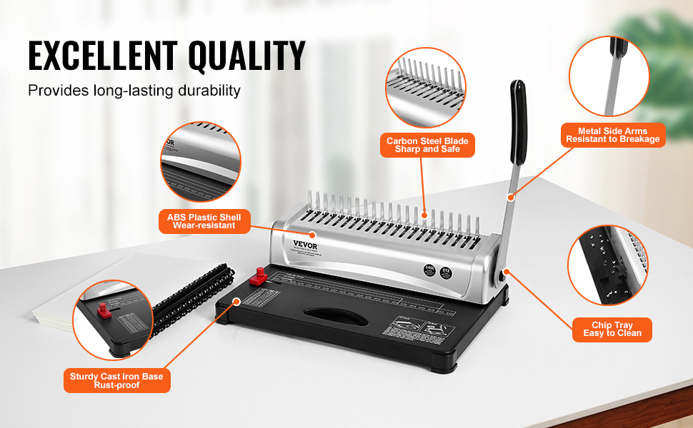 - Sturdy & Durable Material: Crafted with a cast iron base with a powder-coated surface, our book binder is robust and rust-resistant. The ABS plastic shell is wear-resistant and not easily cracked. Metal side arms and carbon steel blades ensure durability and precise punching.