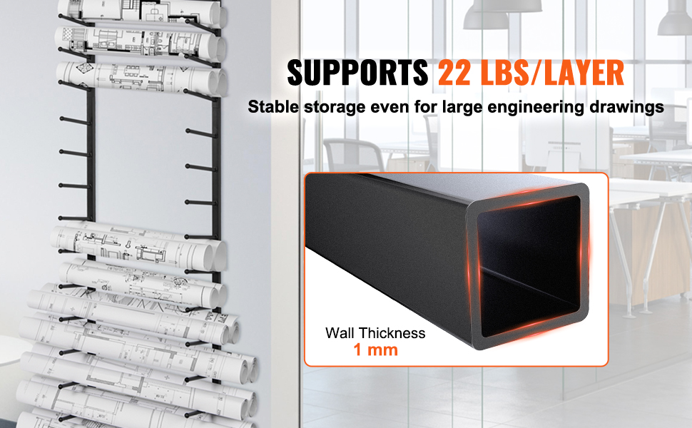 Constructed from thickened metal with a rust-proof powder coating, our blueprint storage organizer ensures long-lasting durability. Both square and round tubes are thickened to enhance loading, ensuring sturdy performance.