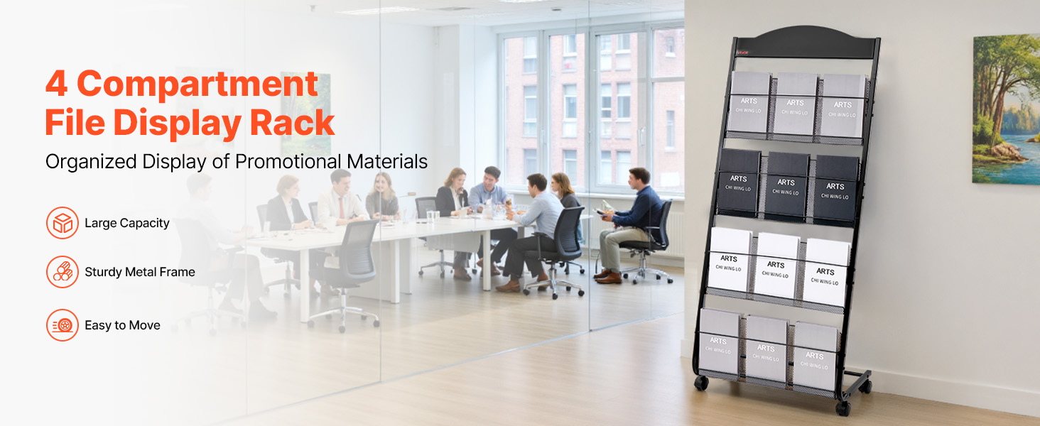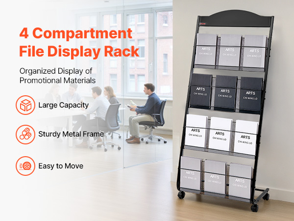 This 4-compartment brochure display rack helps you easily organize and display various promotional materials, documents, magazines, etc. Whether in offices, meeting rooms, or libraries, it keeps materials clearly visible, improving work efficiency and display effectiveness.