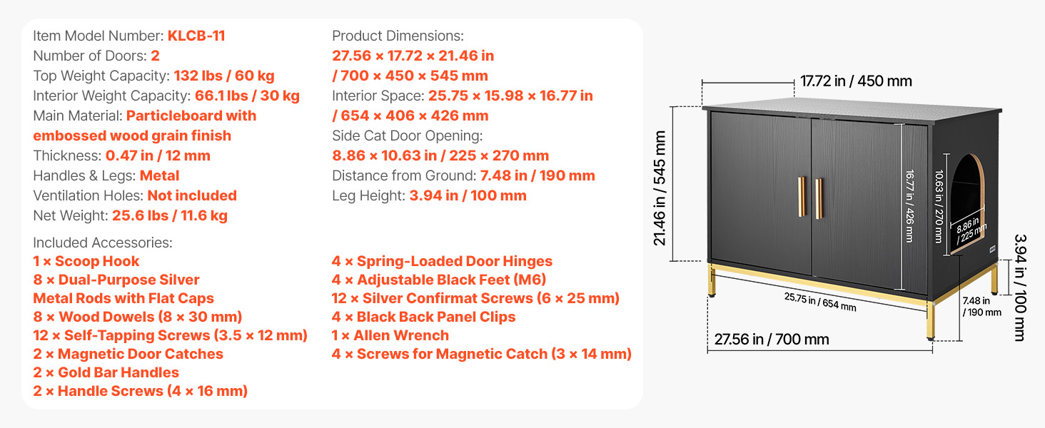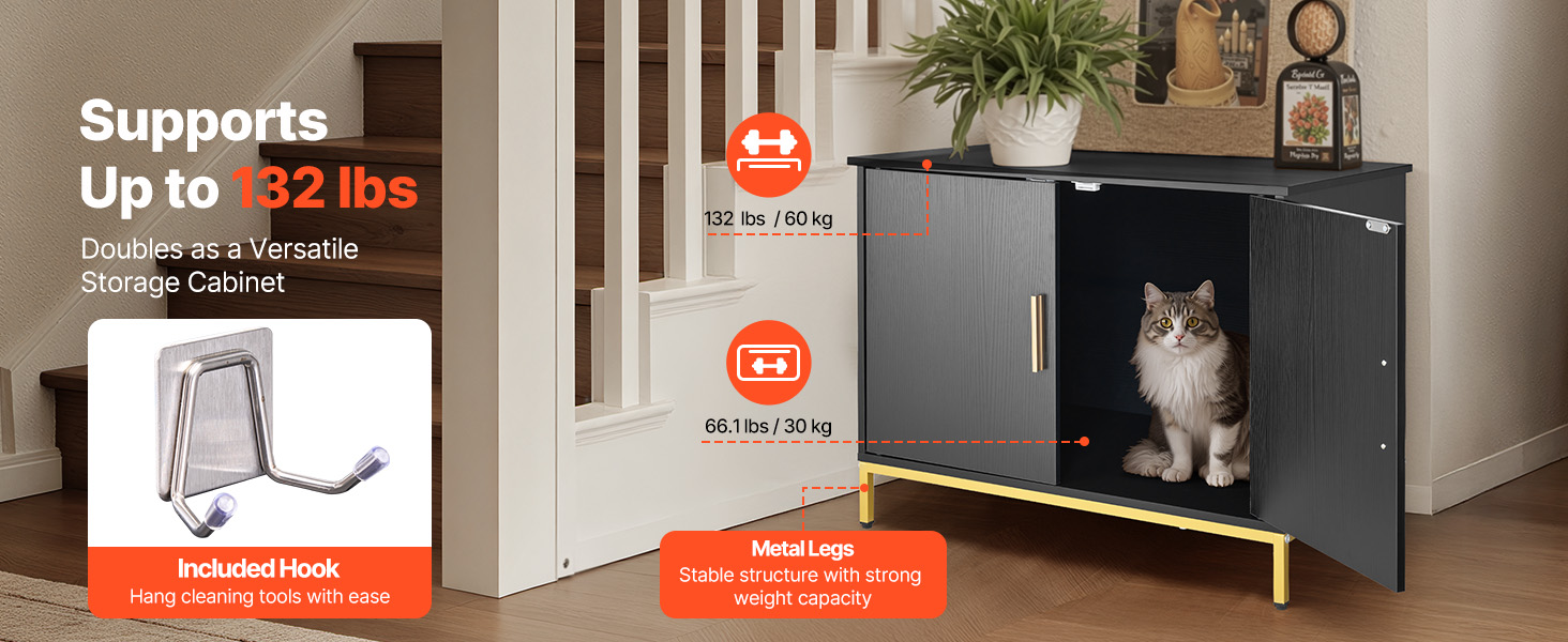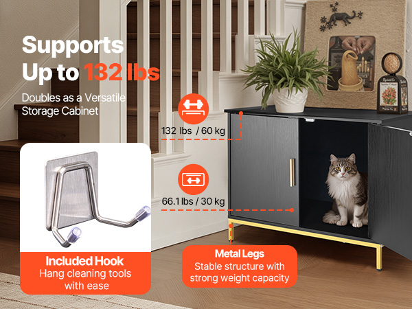 - Stable & Strong Load Capacity: Equipped with metal legs and cabinet structure, this litter box enclosure furniture is stable and durable. It supports 132 lbs on top and 66.1 lbs inside, holding humidifiers, greenery, or books without deformation over time.