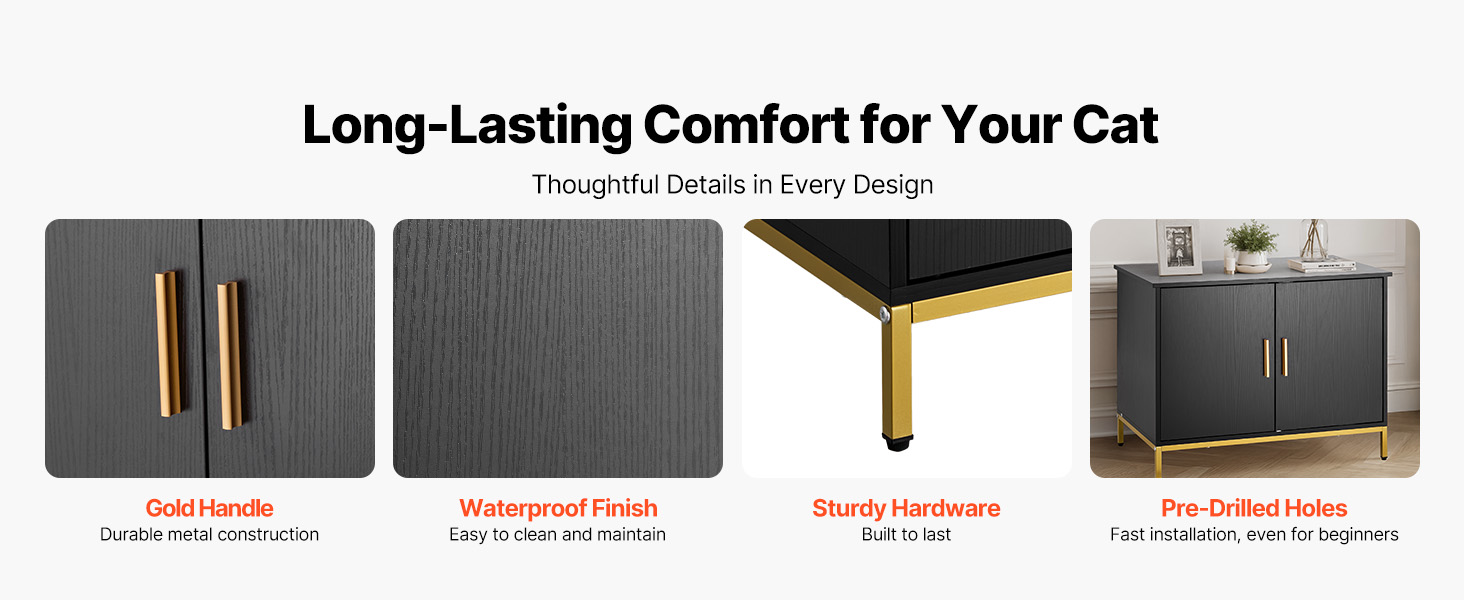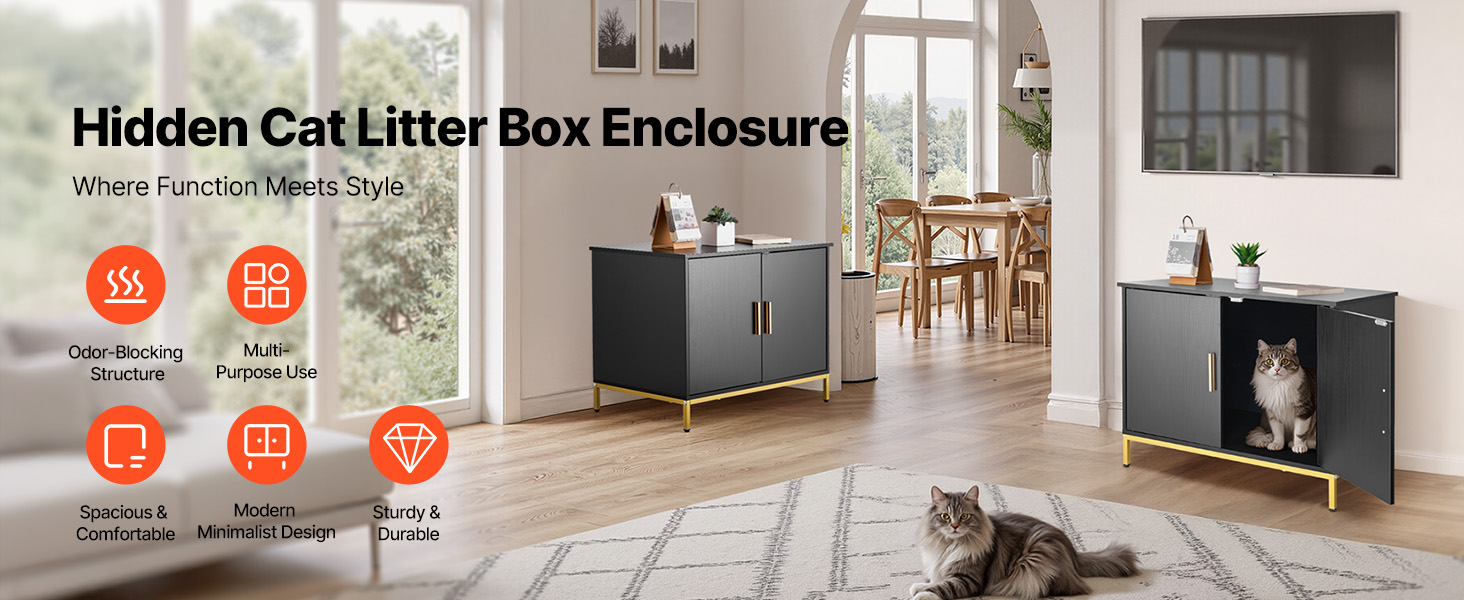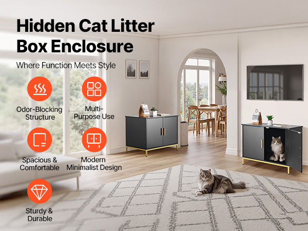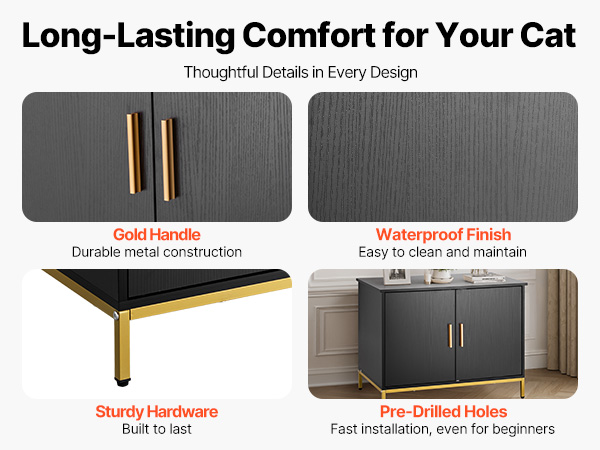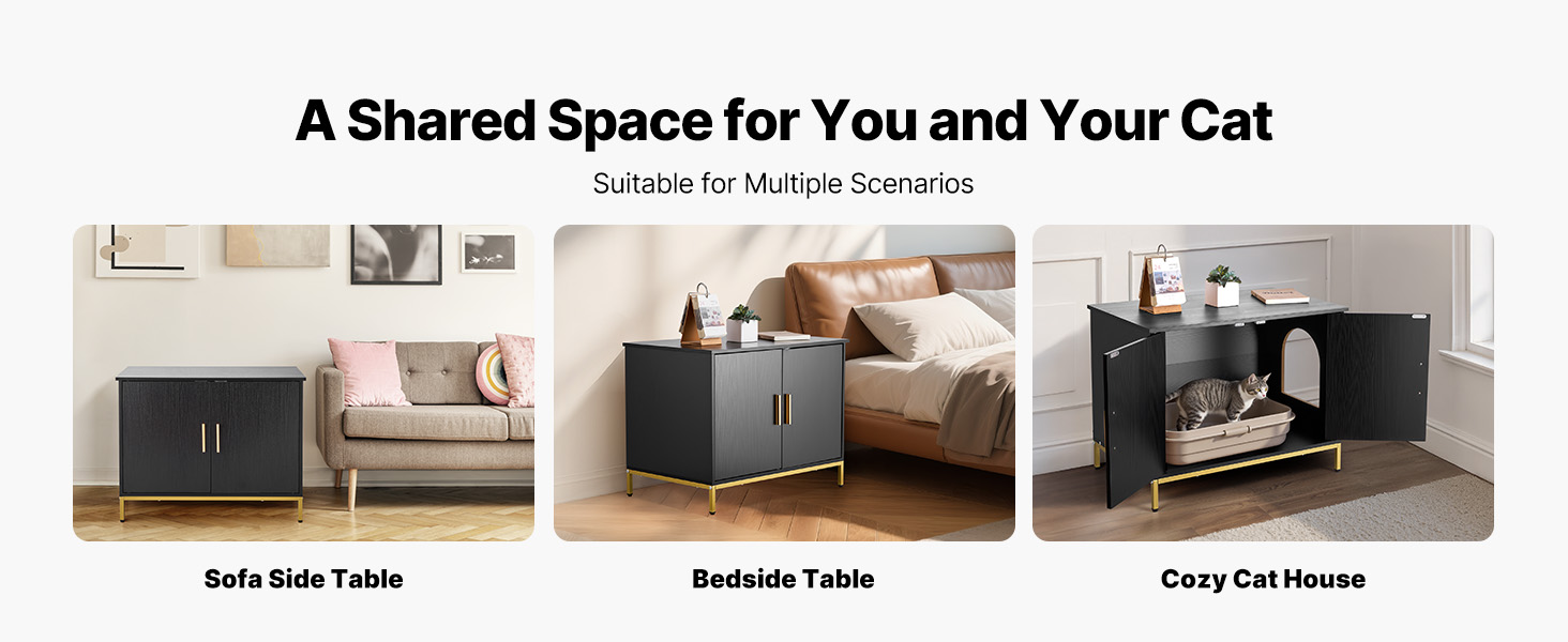 - Multi-Scenarios Use: The cat litter furniture doubles as storage tables, bedside tables, coffee tables, entryway cabinets, or cat resting areas. The black textured embossed cabinet with gold handles and metal legs blends seamlessly into various home styles.