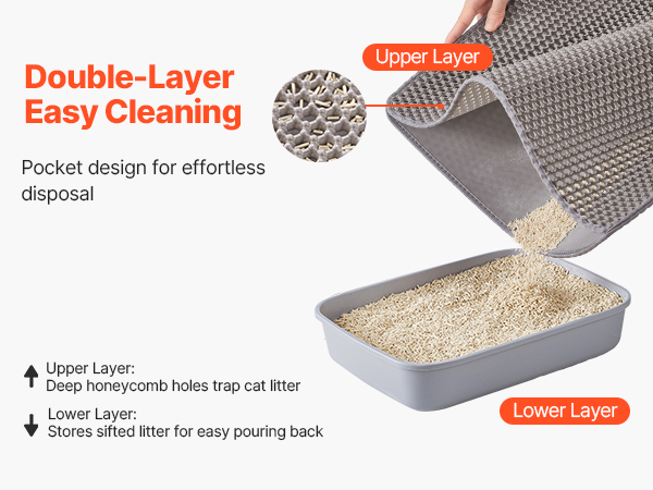 The litter trapping mat’s double-layer design with side-opening pockets allows you to tilt the mat and pour the collected litter back into the box, minimizing waste and making cleanup effortless.