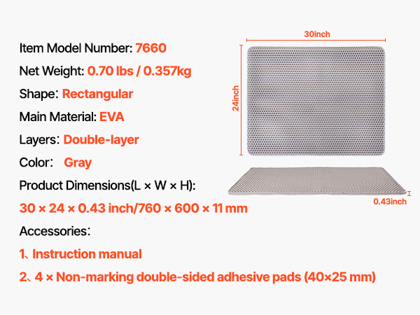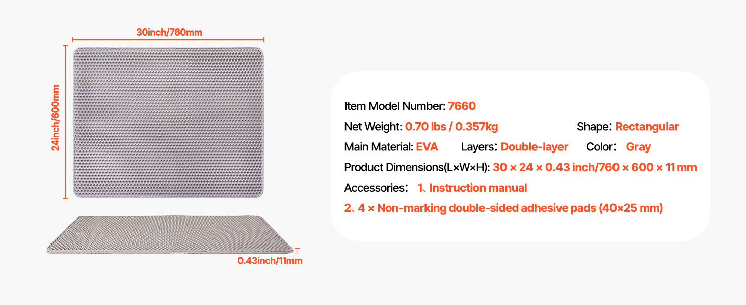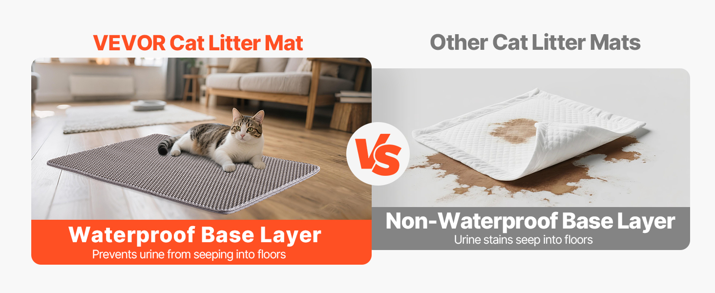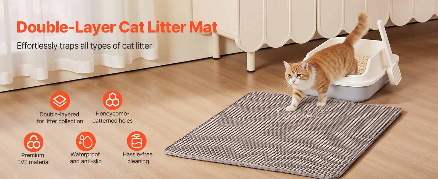 This double-layer cat litter mat features a honeycomb structure that captures and collects litter, keeping your space clean and tidy. The bottom layer is waterproof and non-slip, preventing urine and other liquids from seeping into the floor, protecting hardwood floors and carpets.