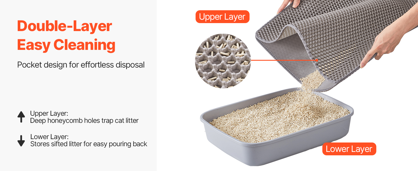 - Double Layer Honeycomb Structure: The double-layer cat litter mat is engineered to minimize litter tracking and maintain clean floors. The top honeycomb holes capture loose litter from the litter box, allowing it to fall through and be safely collected. This mat is compatible with all types of cat litter, including clumping, crystal, and pellet.