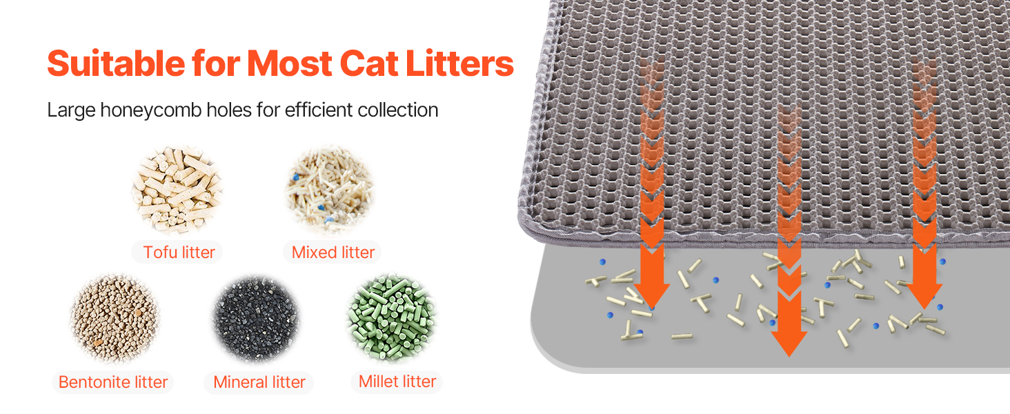 The cat litter box mat features large honeycomb holes that capture most types of litter, including tofu, clumping, bentonite, mineral, and crystal litters.