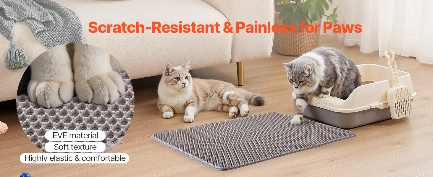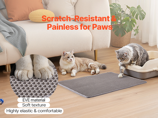 - High-Quality Material: Crafted from premium EVA material, the double-layer litter box mat offers softness, high elasticity, comfort, and scratch resistance against cat claws. Gentle on sensitive paws, it is ideal for walking and resting.