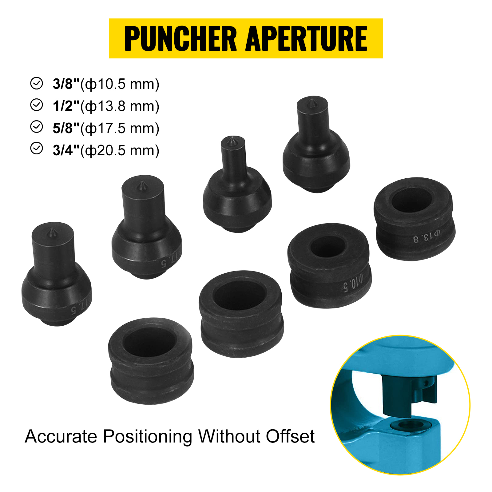 • 4 Pairs of Dies: The hydraulic puncher comes with four pairs of punching dies of 3/8"(ф10.5 mm), 1/2"(ф13.8 mm), 5/8"(ф17.5 mm), 3/4"(ф20.5 mm). Different dies are designed for precise hole punching. It also features accurate positioning without offset.