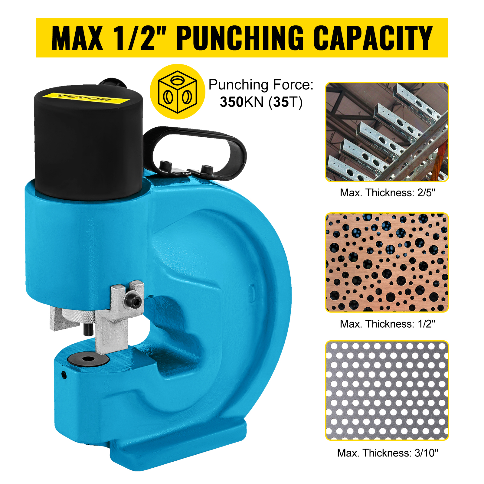- Excellent Punching: Punching Force: 35T/350KN; Throat Depth: 4.3"/109 mm. Punch Dies are made of high carbon tungsten steel and exhibit high wear resistance. Maximum material thickness: Iron Plate: 1/10" to 2/5" (3-10 mm); Copper/Aluminum Bar: 1/10" to 1/2" (3-12.7 mm); Stainless Steel: 1/10" to 3/10" (3-8 mm).