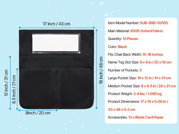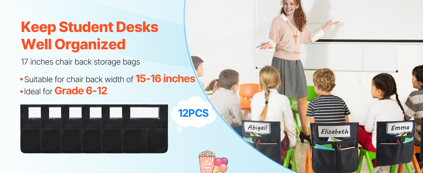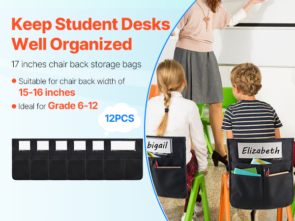 - 12-Piece Chairback Pocket Set: Includes 12 black chair pockets with name tags, ideal for Grade 6-12. Each 17 x 19 inches bag fits 15-16 inches chair backs—great for organizing desks and keeping everything within reach!