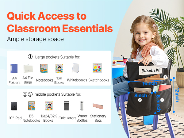 - Tidy Desks: With 1 large pocket (16 x 12 inches) and 2 medium pockets (8 x 8.5 inches), kids can easily store books, notebooks, and supplies. No more clutter—everything is in its place to help them stay focused!