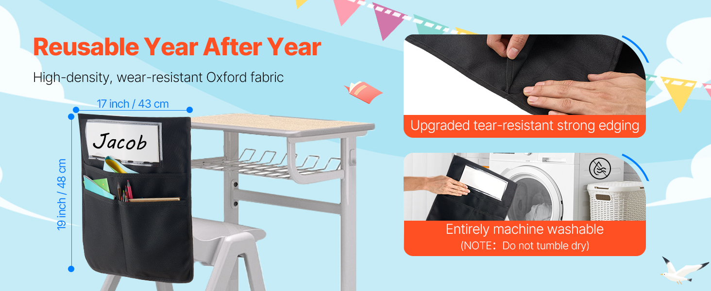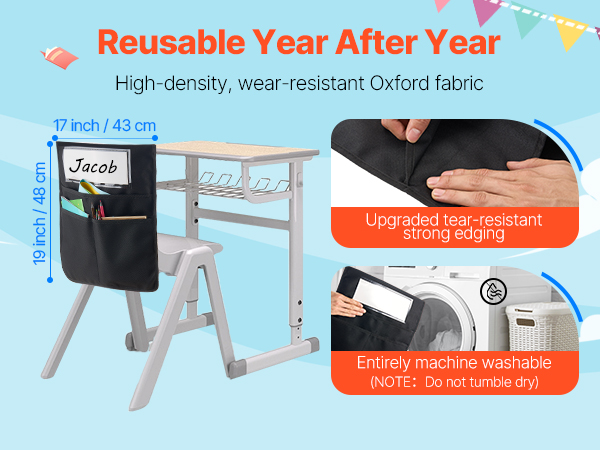 The student chair pocket is crafted with 600D high-density Oxford fabric and upgraded edges for lasting durability. Machine washable—use it over and over without wear and tear.