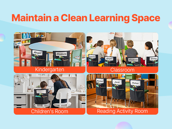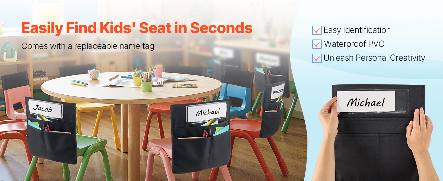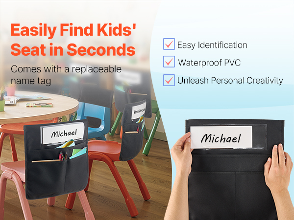 - Quick Setup: Simply slide the seat pocket onto the chair for easy, secure storage. The name tag slot helps with classroom management, making it simple for kids to find their seat!