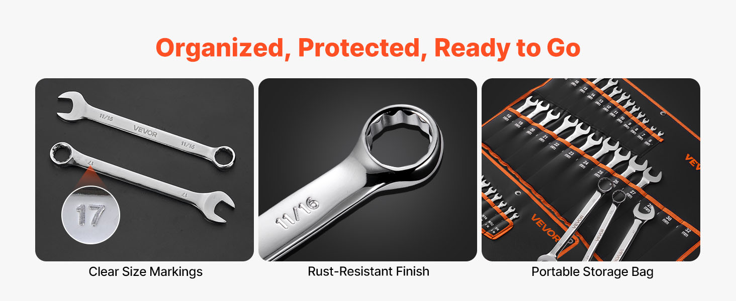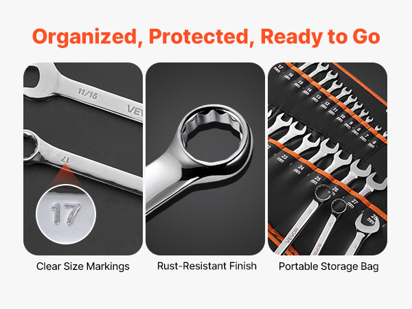 - Organized Storage: Each wrench is clearly labeled and stored in a roll-up pouch for easy organization. Visibly arranged sizes let you grab the right tool quickly. This standard wrench set is ideal for home garages, workshops, or on-the-go repairs