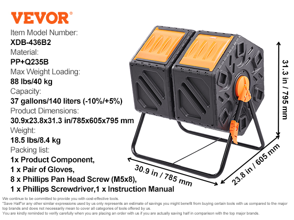 - Dual Chamber, High Capacity: Our compost bin features a dual chamber with a generous capacity of 37 gallons. Perfect for large families and avid gardeners, you can simultaneously compost in one chamber while adding new organic material to the other, reducing overall composting time.