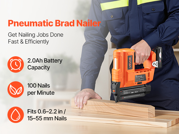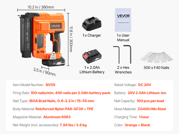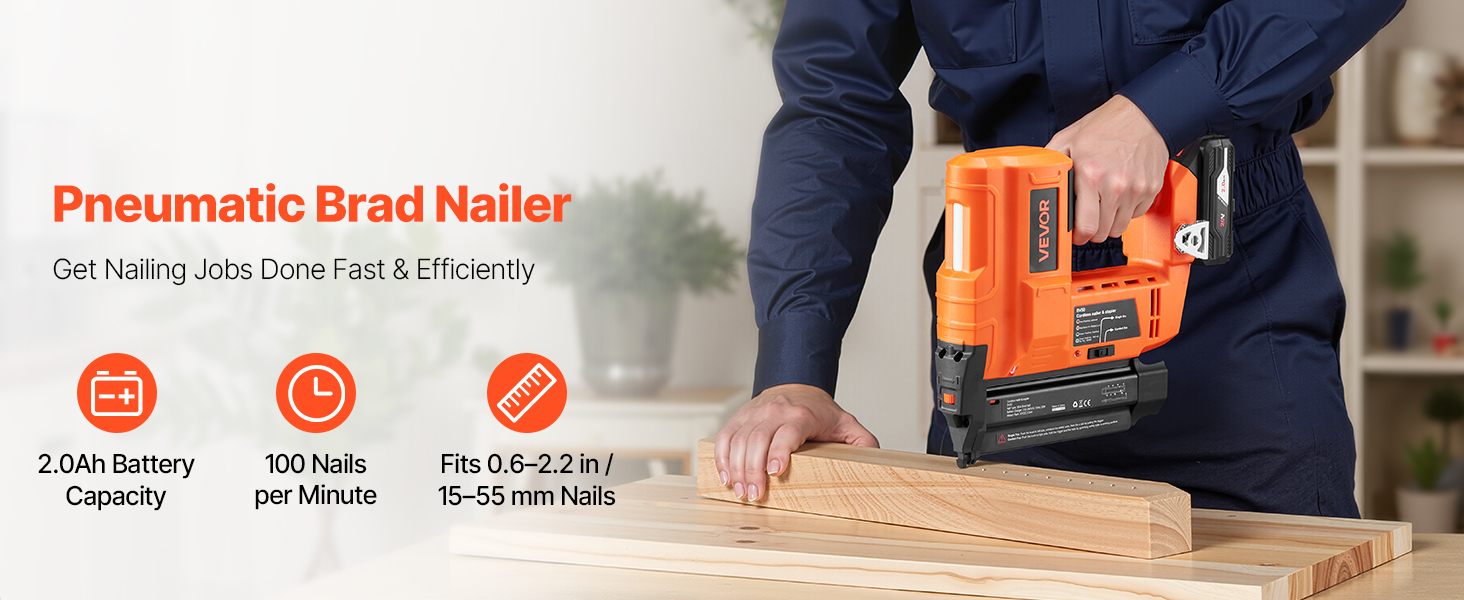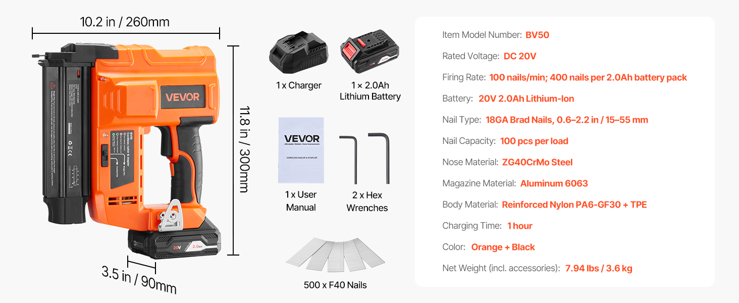 | Nail Type | 18GA Brad Nails, 0.6–2.2 in / 15–55 mm |
