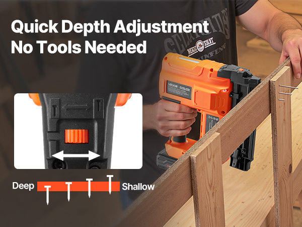 - Tool-Free Depth Adjustment: Our battery powered nail gun easily sets the ideal nail depth without extra tools. Switch quickly between different materials and projects while ensuring each nail is driven at the precise depth for a flawless finish