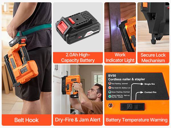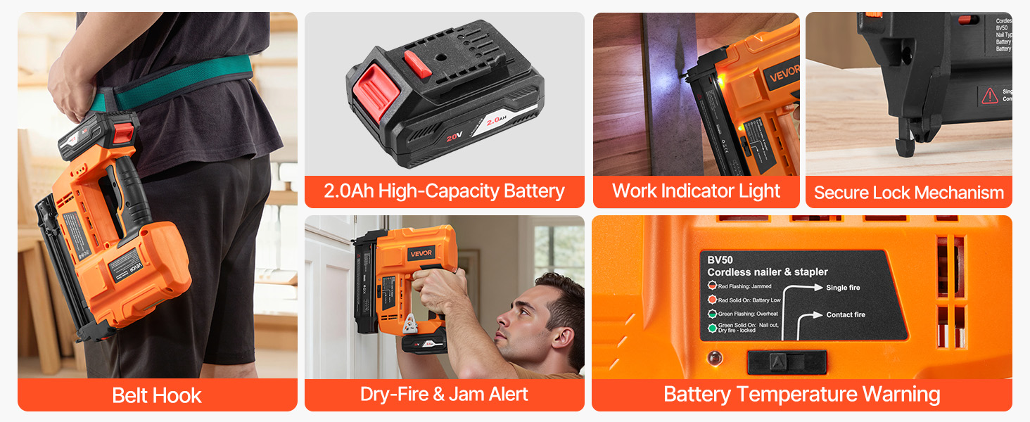 Equipped with a security lock, dry-fire protection, a visible work indicator light, and a jam warning system, this cordless nail gun resists accidental firing and tool damage. Every detail is designed to safeguard you and your workspace.