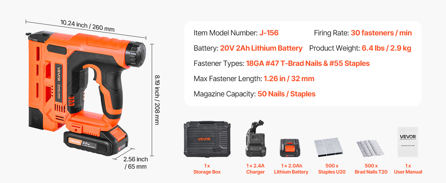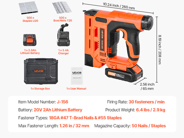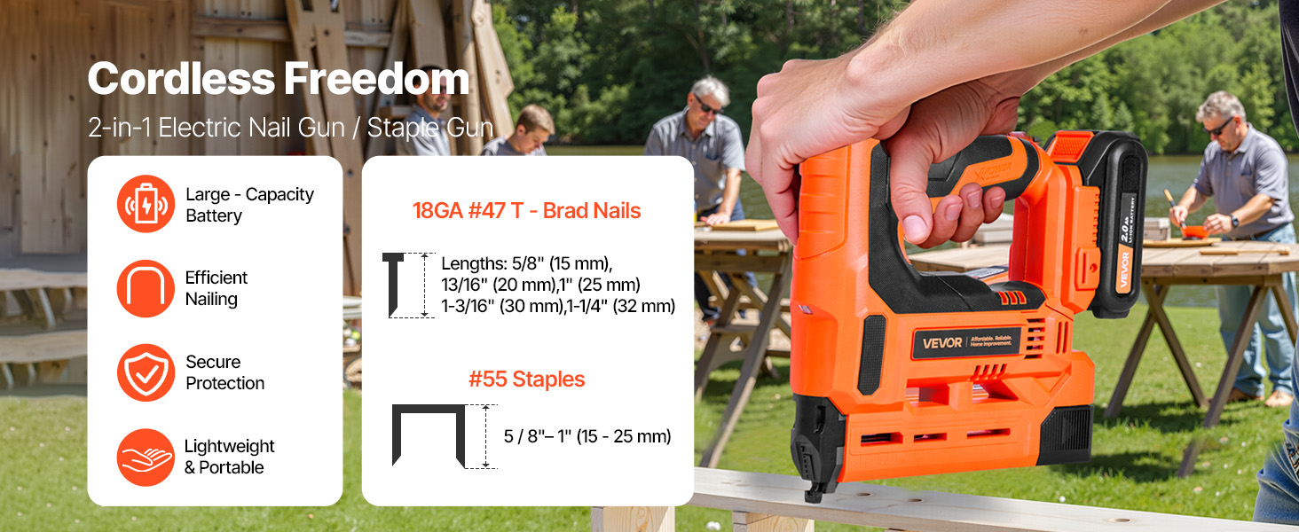 • 2-in-1 Compatibility: This 2-in-1 cordless brad nailer works as a brad nailer and stapler, supporting 18GA Type 47 T brads (5/8 – 1-1/4 inch/15 – 32 mm) and Type 55 U staples (5/8 – 1 inch/15 – 25 mm)