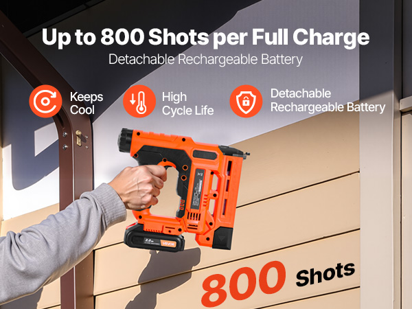 This cordless nail gun features a high-capacity battery capable of firing up to 800 nails on a full charge. The battery ensures long service life and stays cool during use, allowing you to work for extended periods without interruption.