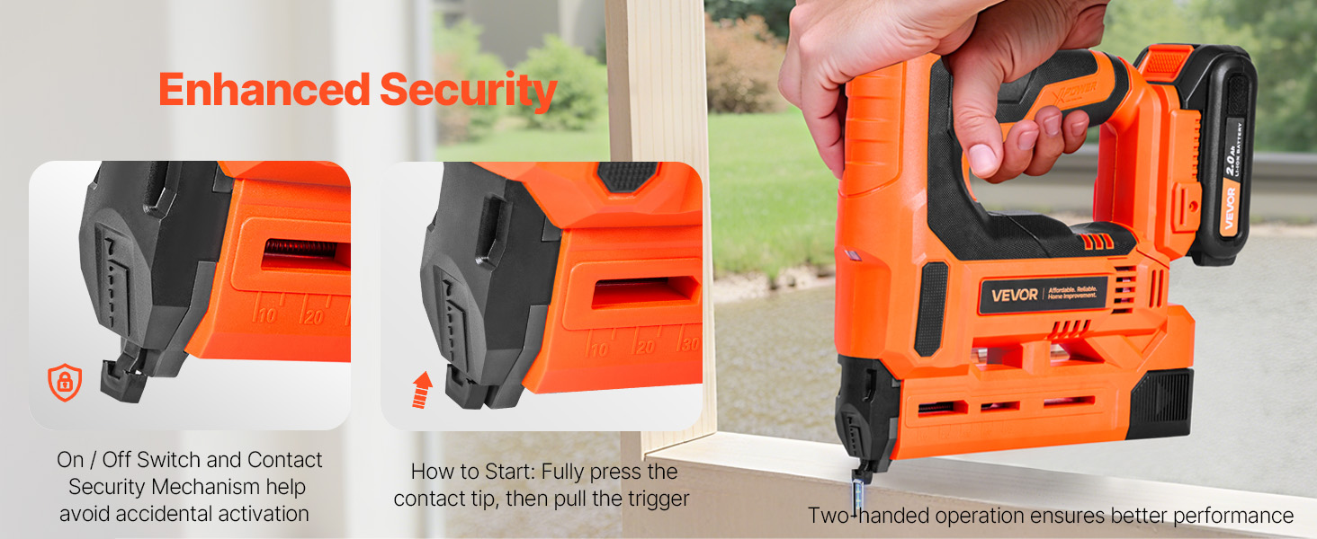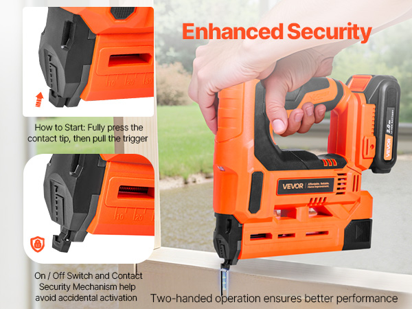 The on/off switch paired with a contact security mechanism helps avoid unintended activation. To start the cordless staple gun, fully press the contact tip, then pull the trigger—dual-layer protection for added security.