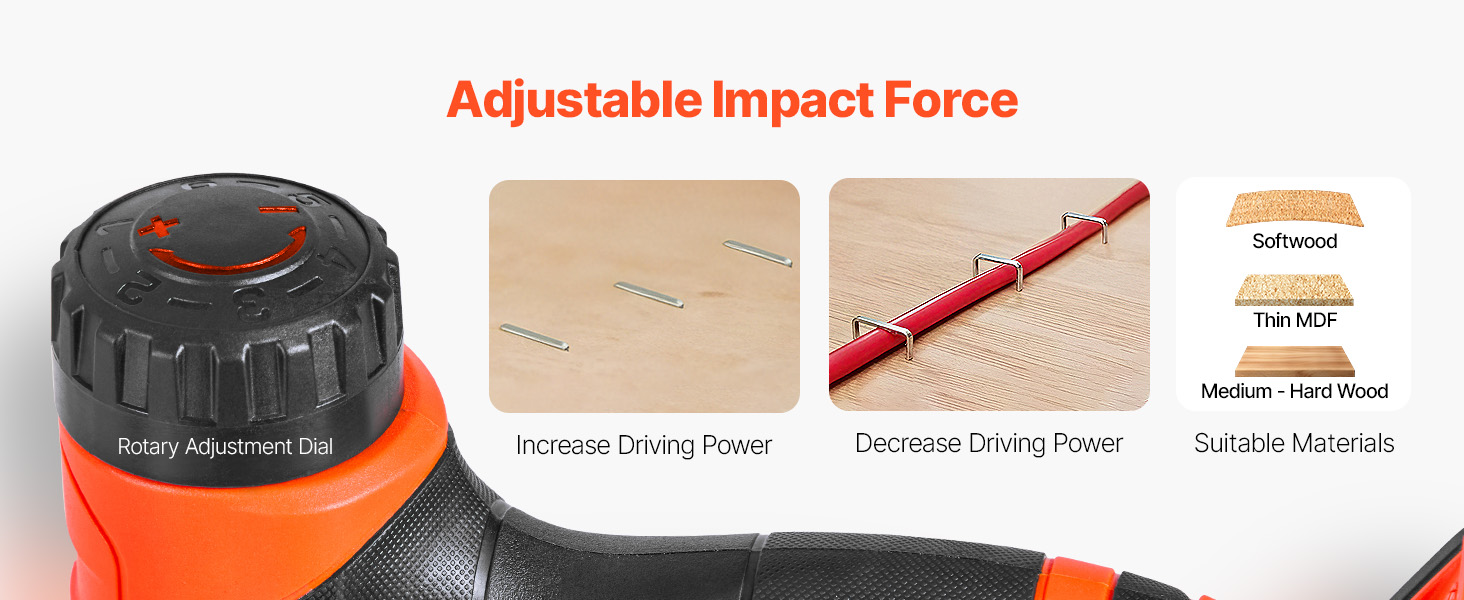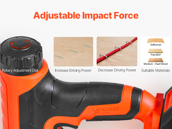 • Efficient Driving: Powered by a strong motor, the cordless staple gun delivers steady force and up to 30 nails/min. It rapidly sets nails into wood and similar materials, allowing you to adjust the force base on the material for precise results
