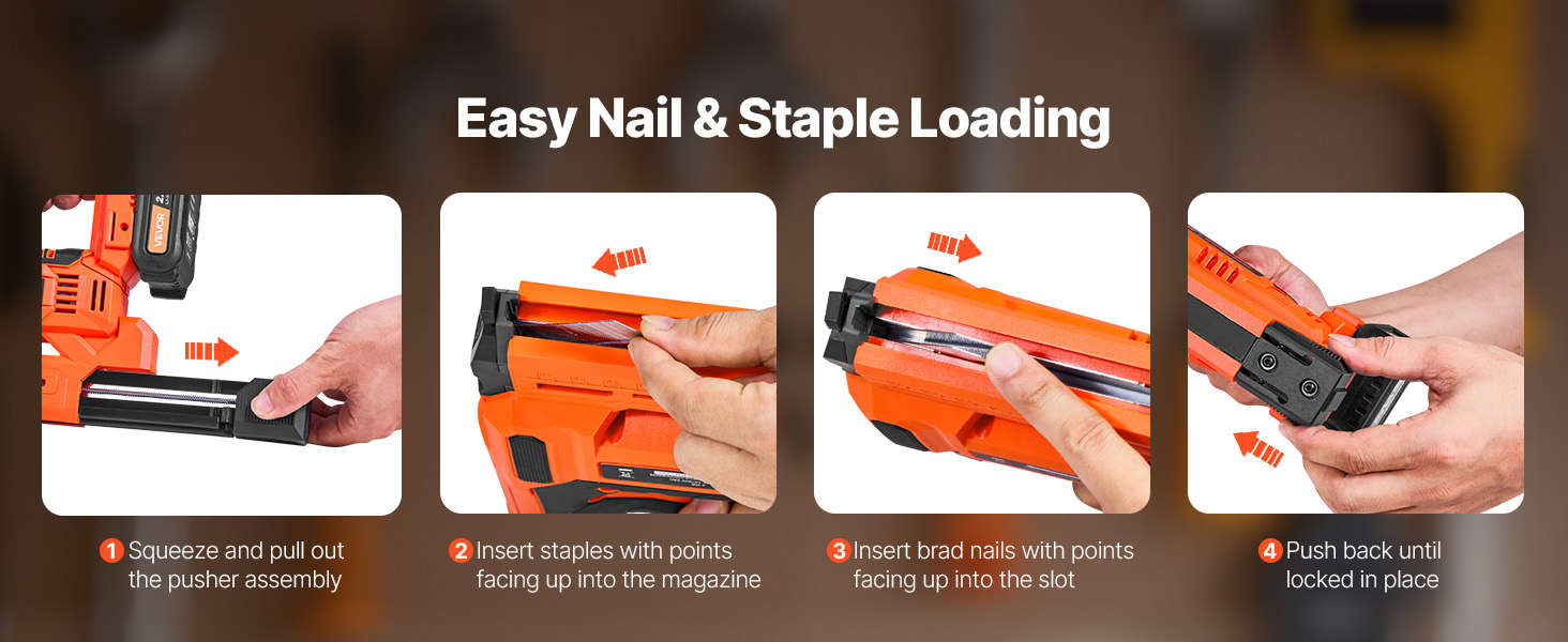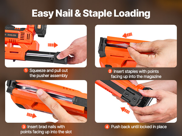 Want to refill the magazine of the electric brad nailer? Follow four quick steps to reload—simple and efficient.