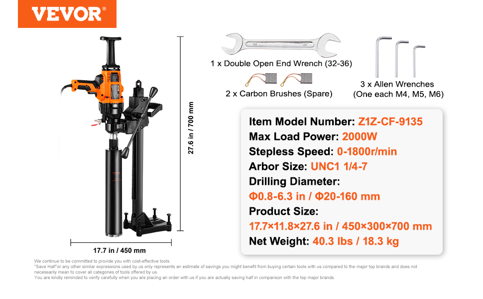 - Professional Accessories Included: The core drilling machine comes with a Φ3.3 in / Φ83 mm drill bit, enabling you to complete large-diameter drilling tasks with ease. It also includes two carbon brushes and a double-ended wrench for quick and easy maintenance.