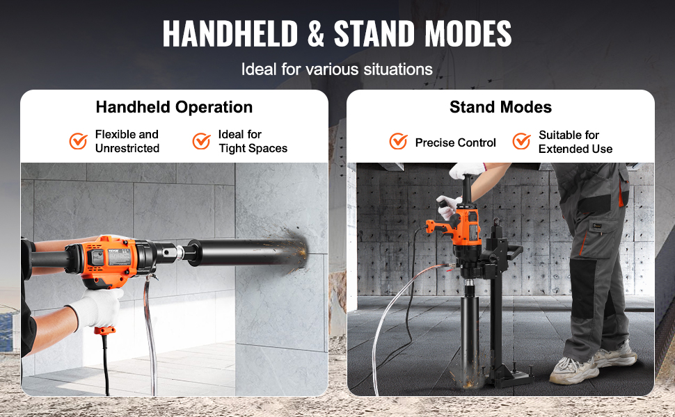 Our core drill rig features handheld and stand-mount modes to suit your task. The handheld mode is ideal for flexible operation and precise control, while the stand-mount mode provides added stability, making it perfect for large-scale or extended projects and reducing operator fatigue.