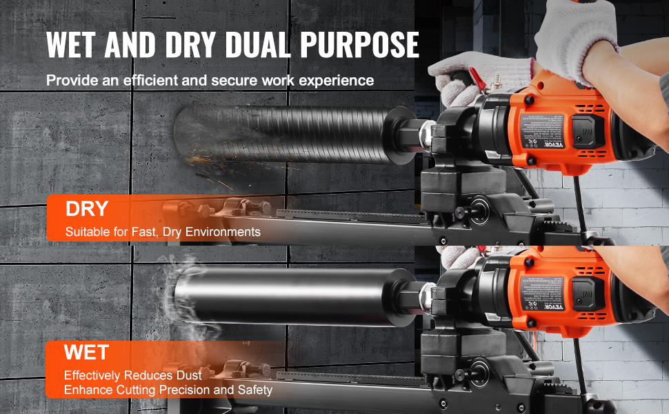 - Wet & Dry Cutting Capabilities: Our concrete core drill supports both dry and wet cutting modes. Dry cutting is ideal for fast drilling in dry environments or high-efficiency scenarios, while wet cutting reduces dust and heat, providing enhanced safety and comfort during operation.