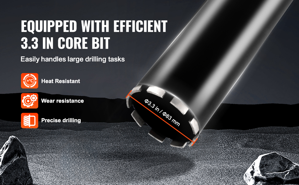Equipped with a Φ3.3 in / Φ83 mm large-diameter drill bit, this concrete core drill excels in large-scale projects or specialized applications. Whether it’s construction, renovation, or DIY tasks, this drill ensures every hole is precise and accurate.