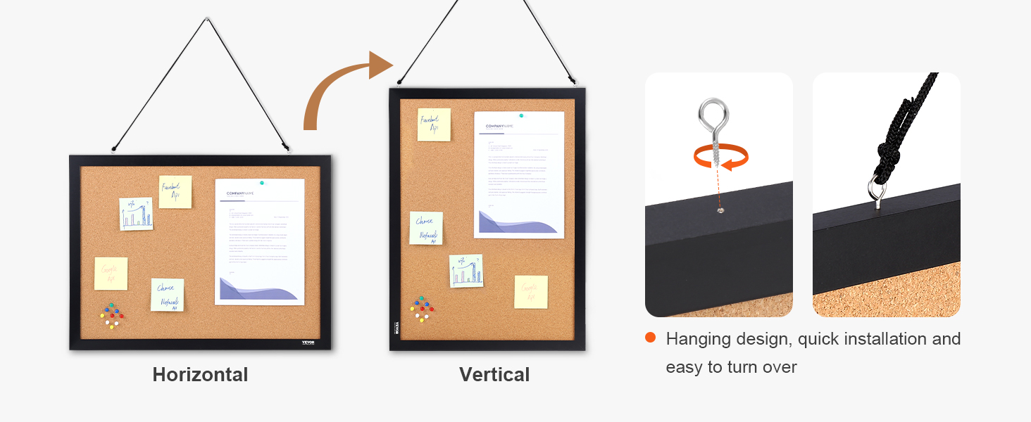 - Flexible Installation: Our cork boards for walls can be hanging horizontally or vertically, perfect for any space. And thanks to its hanging design, you can easily switch between the two sides.